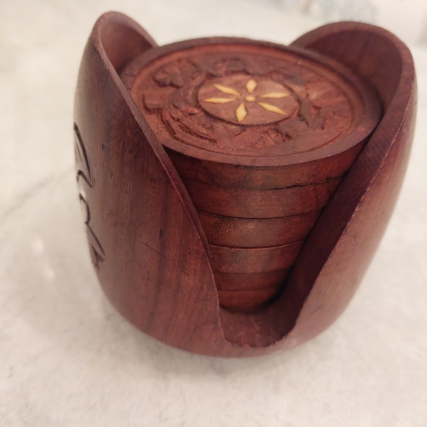 Beautiful Indian carved coasters inlaid with petal style motif. Six coasters in total in their own matching carved holder. Would make an elegant addition or gift for any household.