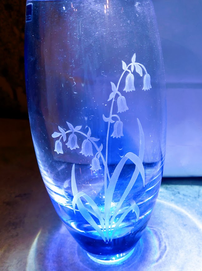 A pristine Caithness etched vase from the 1970’s. More commonly seen with the daffodil etching not only are these bluebell etchings uncommon but also the intense blue colour of the glass, and this makes this vase an eye catching addition even when empty.