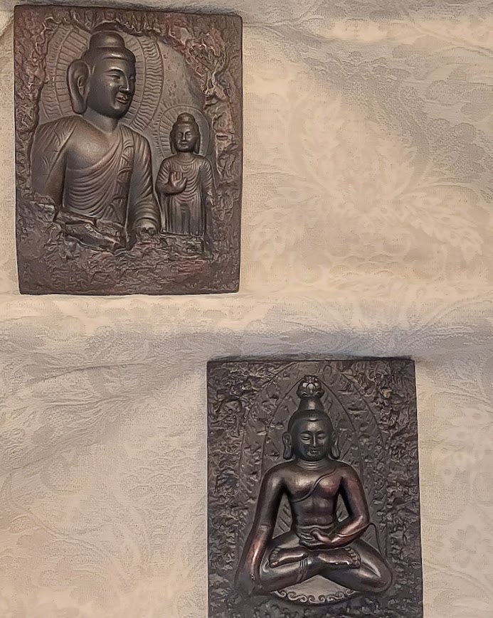 A very decorative pair of wall plaques depicting Tibetan Buddha images. Made to resemble bronze toned plaster they are suitable for interior and exterior use, although I would advise protection or bringing inside during the winter.