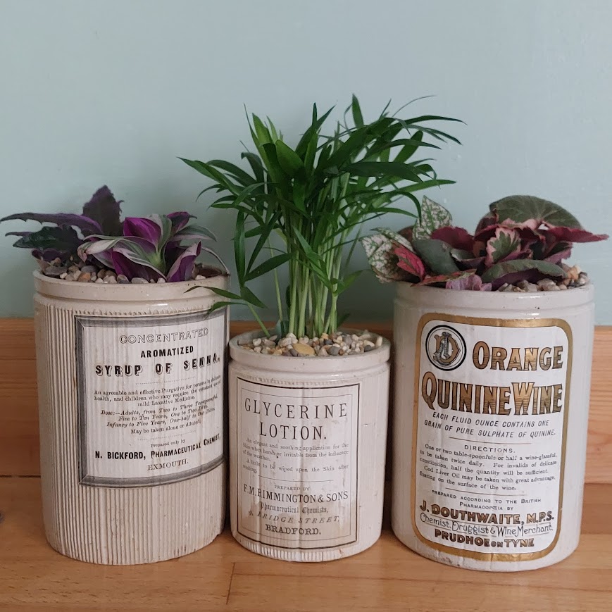 A lovely set of 3 decorative jars that have been given that antiqued finish and reproduction labels. Simple and neutral they could be used in any room for plants, candles ,cosmetics or just as a quirky, but in vogue, interior piece on display. Fun to read and discuss the reproduction but genuine wording on the labels from days gone by.