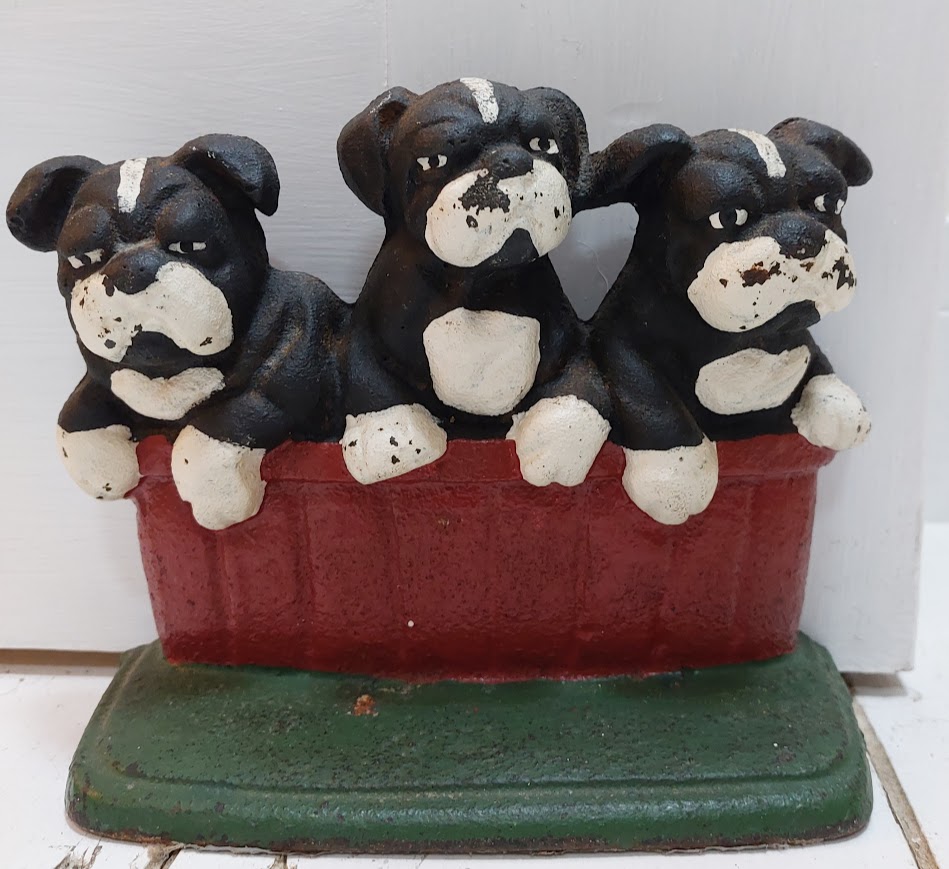 A cast iron doorstop of Bulldog Puppies in a basket. This is the painted version of this casting and it still has its’ original paintwork. Cute, collectable and functionable who could want for more.