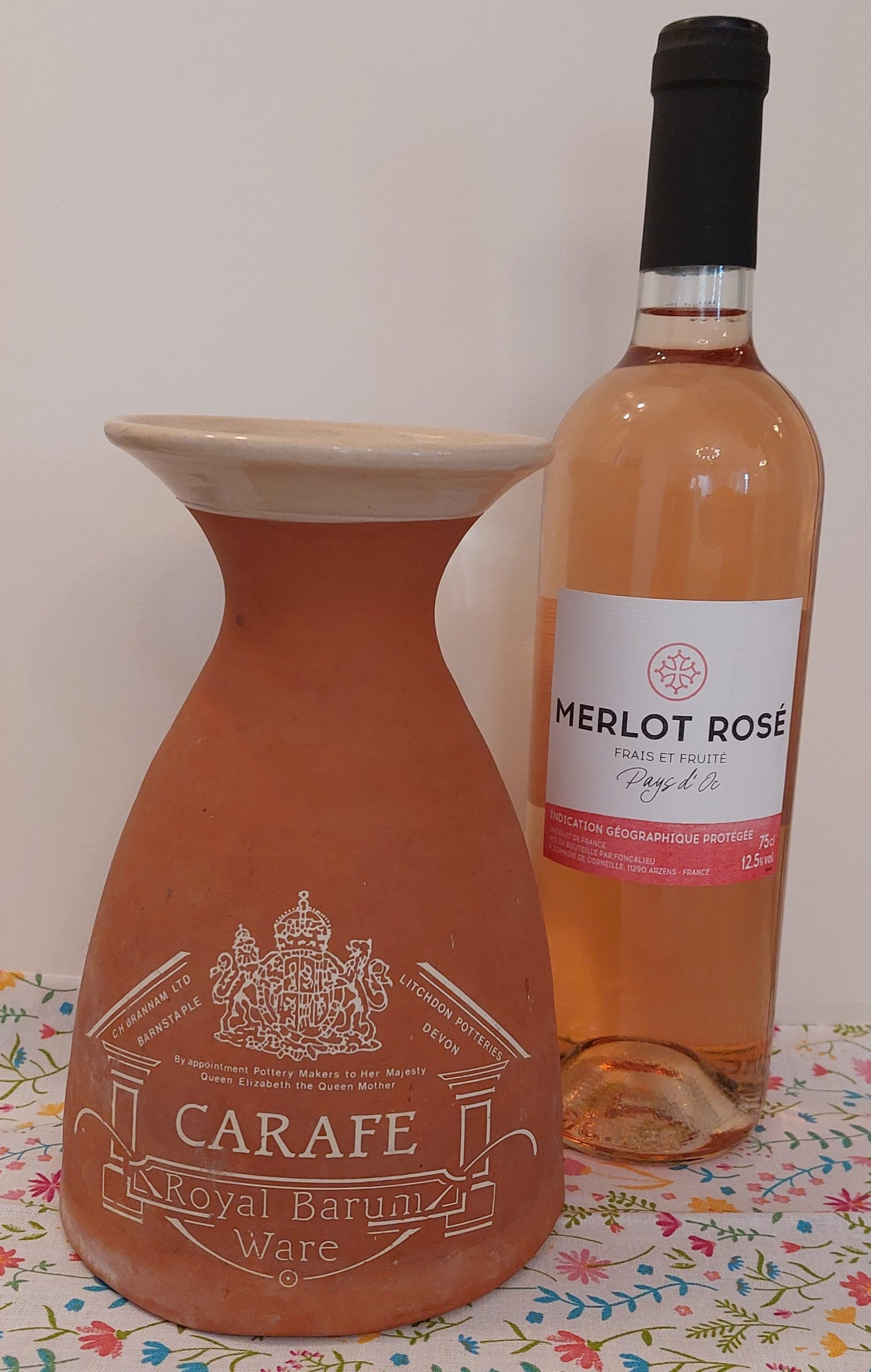 Royal Barum Ware Litchdon Pottery Terracotta Carafe with rarely found cream slip glazed rim (usually brown). There is some wear on the front as seen in the picture ,from use, but no chips. The perfect addition for those lazy afternoons in the garden with a rose and friends, decant the wine into the carafe, place in fridge and the carafe will help it to remain cool while you relax. Capacity 1 ltr. NB Wine and glasses not included