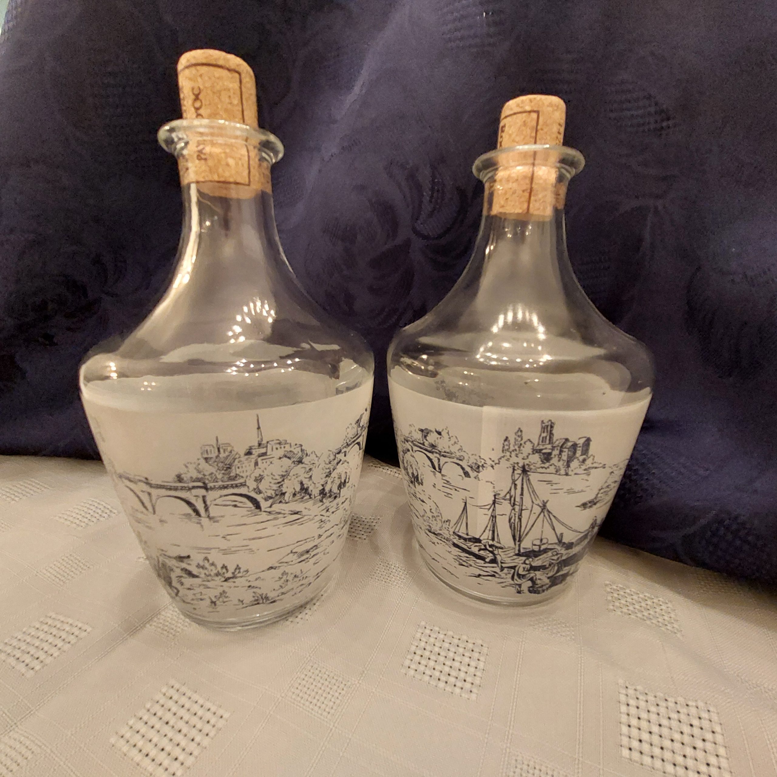 Two beautiful vintage 1/2 carafes with blue old French countryside scenes. I have placed corks in the tops but these are easily removed if not required. They would also make really enchanting little vases with spring/summer blooms inside. Capacity 1/2 Ltr.