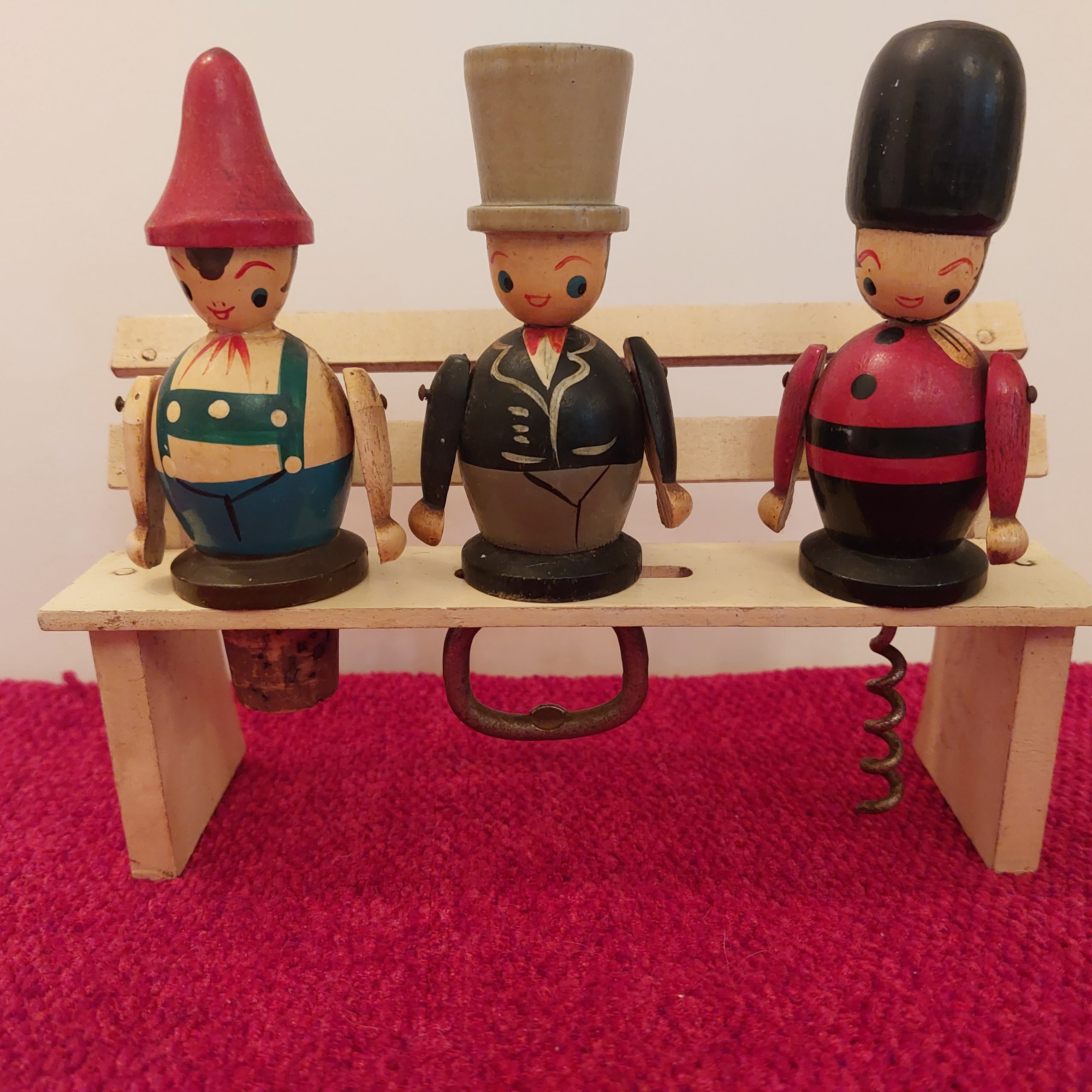A very unusual and cute vintage bar set. 3 wooden characters with moving arms topping a cork, corkscrew and bottle opener, all sitting on a bench. The perfect addition to a home bar or the man who has everything. Give your guests something to to be envious over.