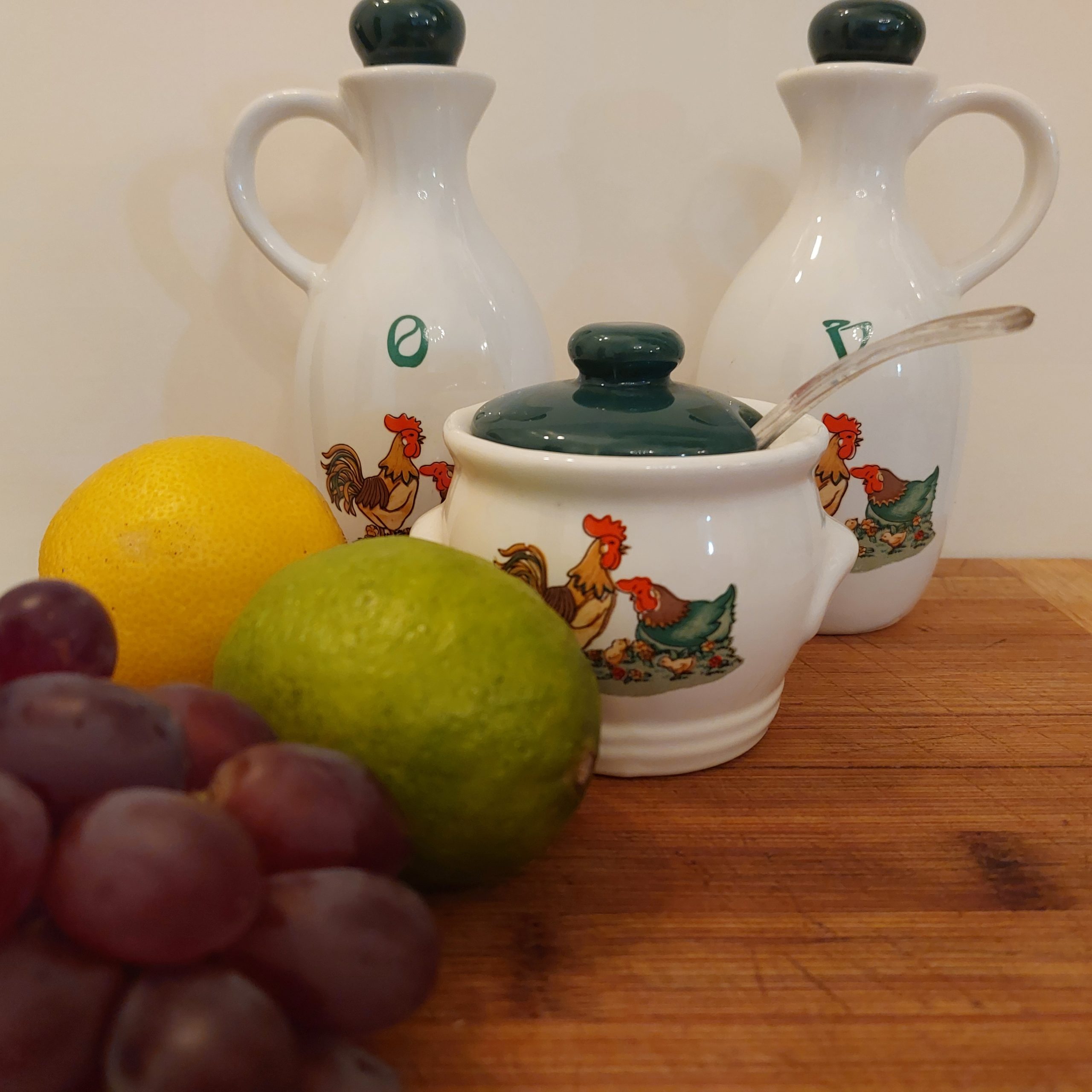Retro farmhouse quirky table set with rooster and hen picture. Lovely addition for those BBQ salads, drizzle with oils or salad dressings. Original stoppers and spoon as shown in picture are damage free.