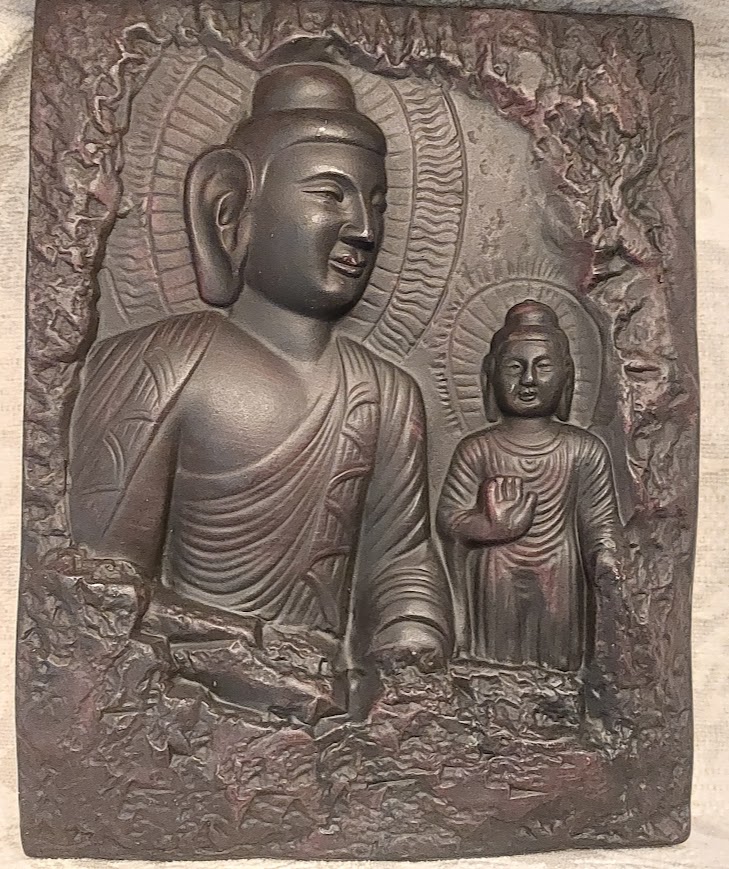 A very decorative pair of wall plaques depicting Tibetan Buddha images. Made to resemble bronze toned plaster they are suitable for interior and exterior use, although I would advise protection or bringing inside during the winter.